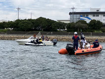 須磨ヨットハーバーにおいて神戸海上保安部、神戸市水上消防署、兵庫県、神戸市との官民合同パトロールを行いました(2025.7.19)